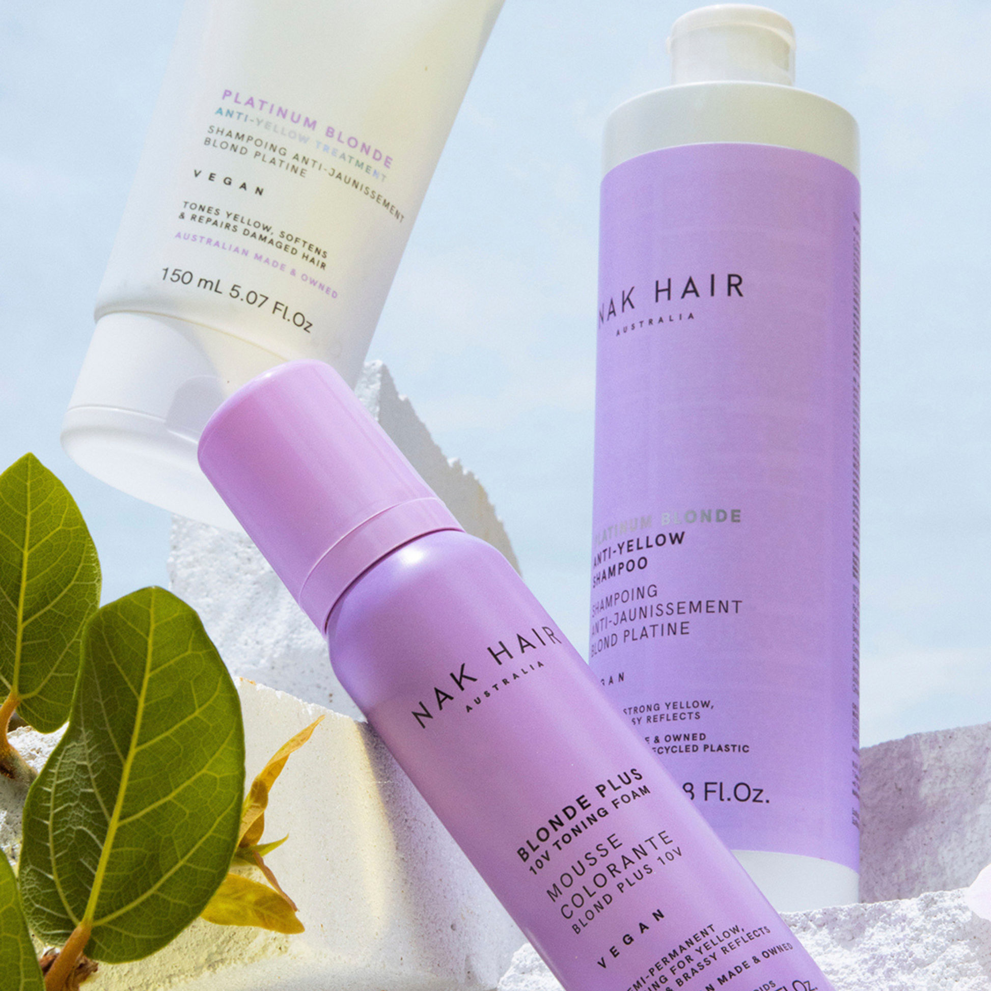 Tip: Alternate between NAK Replends Moisture Mask and NAK Platinum Blonde Anti-Yellow Treatment.